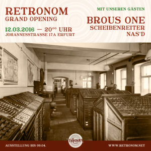 Das erste halbe Jahr voller Ausstellungen und Konzerte war bereits Geschichte, bis am 12. März 2016 das »Retronom« endlich offiziell eröffnet wurde. An diesem Abend wurde der Laden förmlich überschwemmt von kulturinteressierten jungen Menschen, denen die Freude ins Gesicht geschrieben stand, darüber, dass sich nach dem Ende des Centrum Clubs mit dem Retronom und einigen weiteren unabhängigen Locations nun langsam wieder neue Kultur-Einrichtungen in Erfurt etablieren würden.
