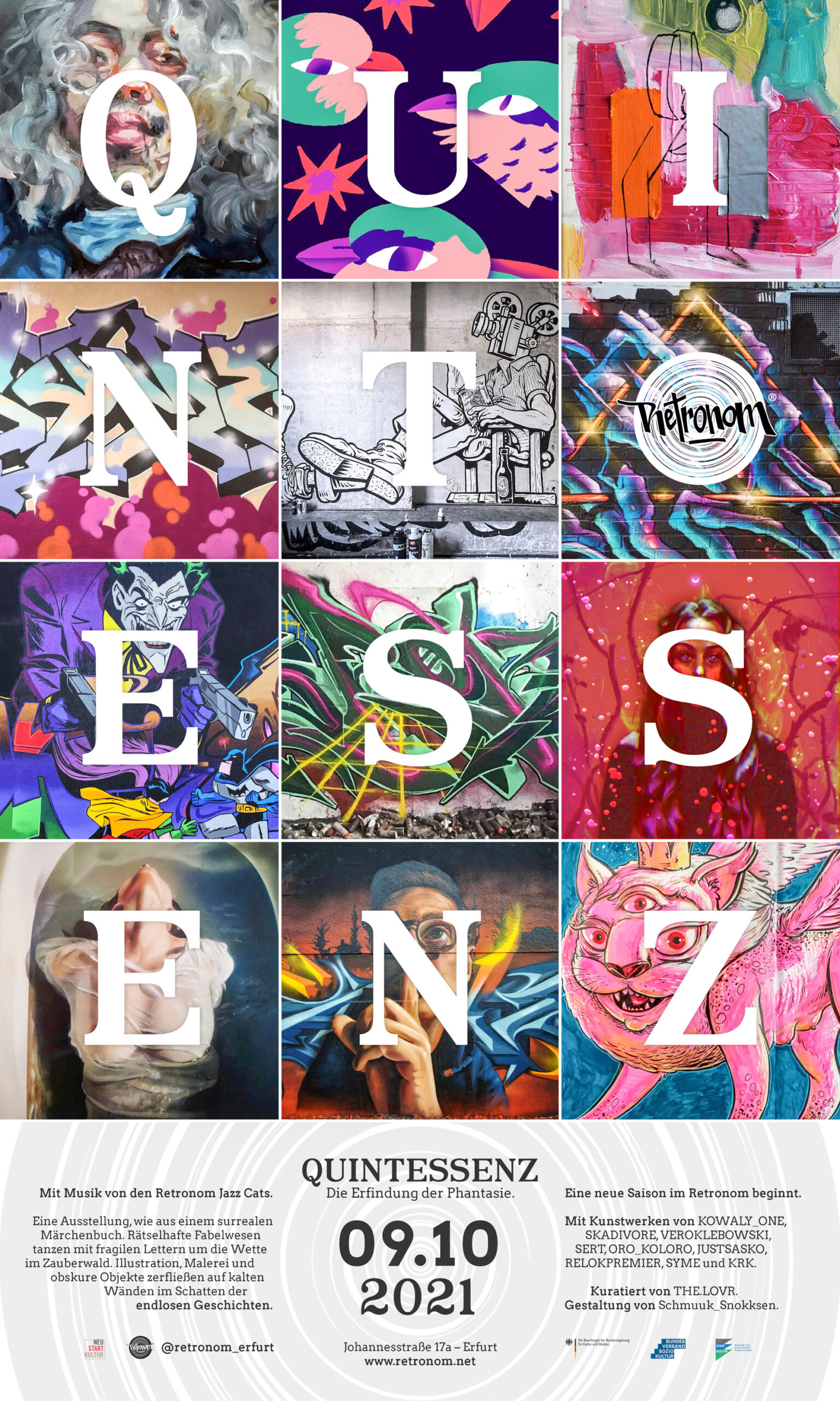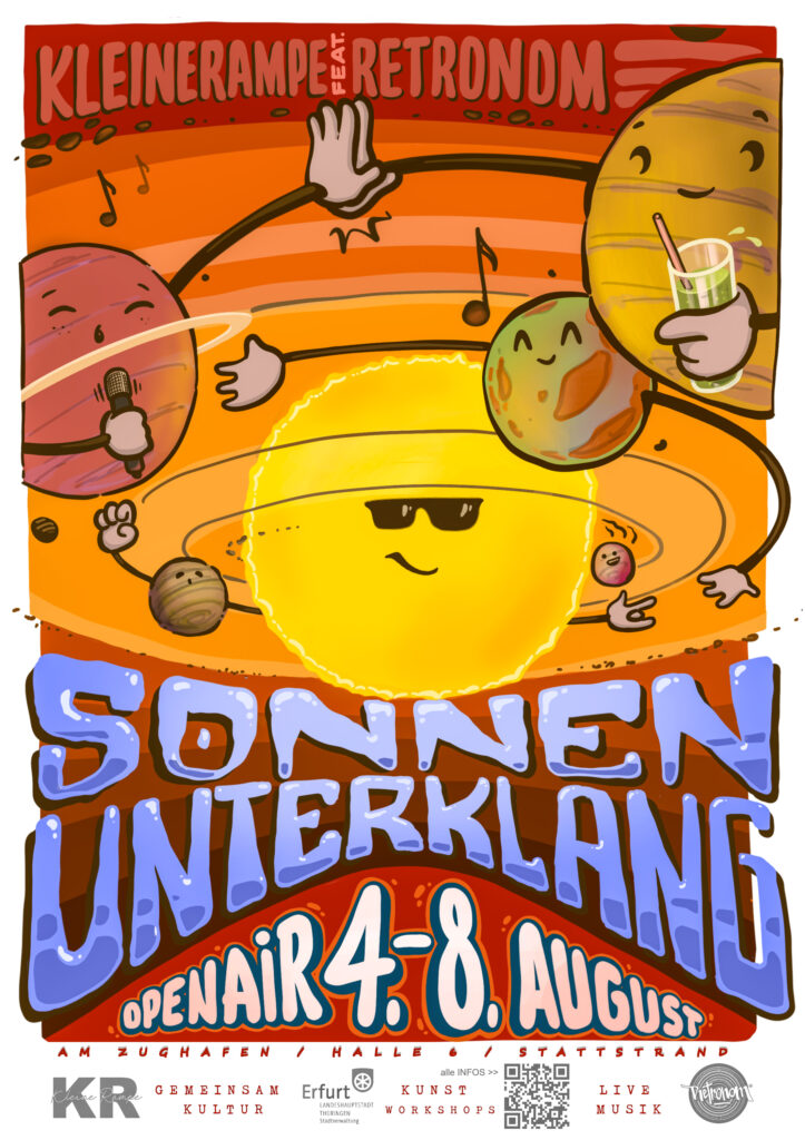 Bei regelmäßigen Live-Painting-Aktionen kann direkt zum Pinsel gegriffen und losgelegt werden. Gelegentlich finden auch Workshops aus den Bereichen Tanz, Theater, Graffiti oder anderen kreativen Bereichen statt. Auch alle Sprachakrobatinnen sind beim Retronom Open Mic herzlich eingeladen, ihre Ausdrucksfähigkeit und Wortgewandtheit unter Beweis zu stellen. Und bei den mittlerweile fest im Erfurter Veranstaltungskalender etablierten Formaten Juicy Tuesday und ÜKS am Freitag Abend wird natürlich auch die Gelegenheit geboten, zu wechselnden DJs zu tanzen und einfach mal den Kopf frei zu bekommen. So hat im Retronom wirklich jede*r die Möglichkeit, das eigene künstlerische Potenzial zu entdecken, zu entfalten und zu verwirklichen.